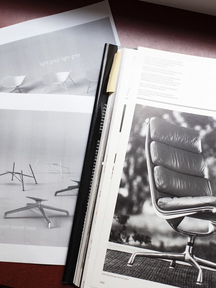 MJ: George Nelson is lényegében azt állítja, az ideális iroda egy nappalival egyenlő. Nos, így kéne a terméknek is megjelenni: ez nem csak egy munkaeszköz. Ez egy olyan bútordarab, amit otthonra is szeretnél – mint az Eames Lounge Chair. Úgy döntöttünk, hogy az Eames Lounge Chair egy férfias bútor, és talán egy női társat kéne mellé terveznünk. Így lenne egy párunk, akiknek nem kell egymással versengeinük a piacon.