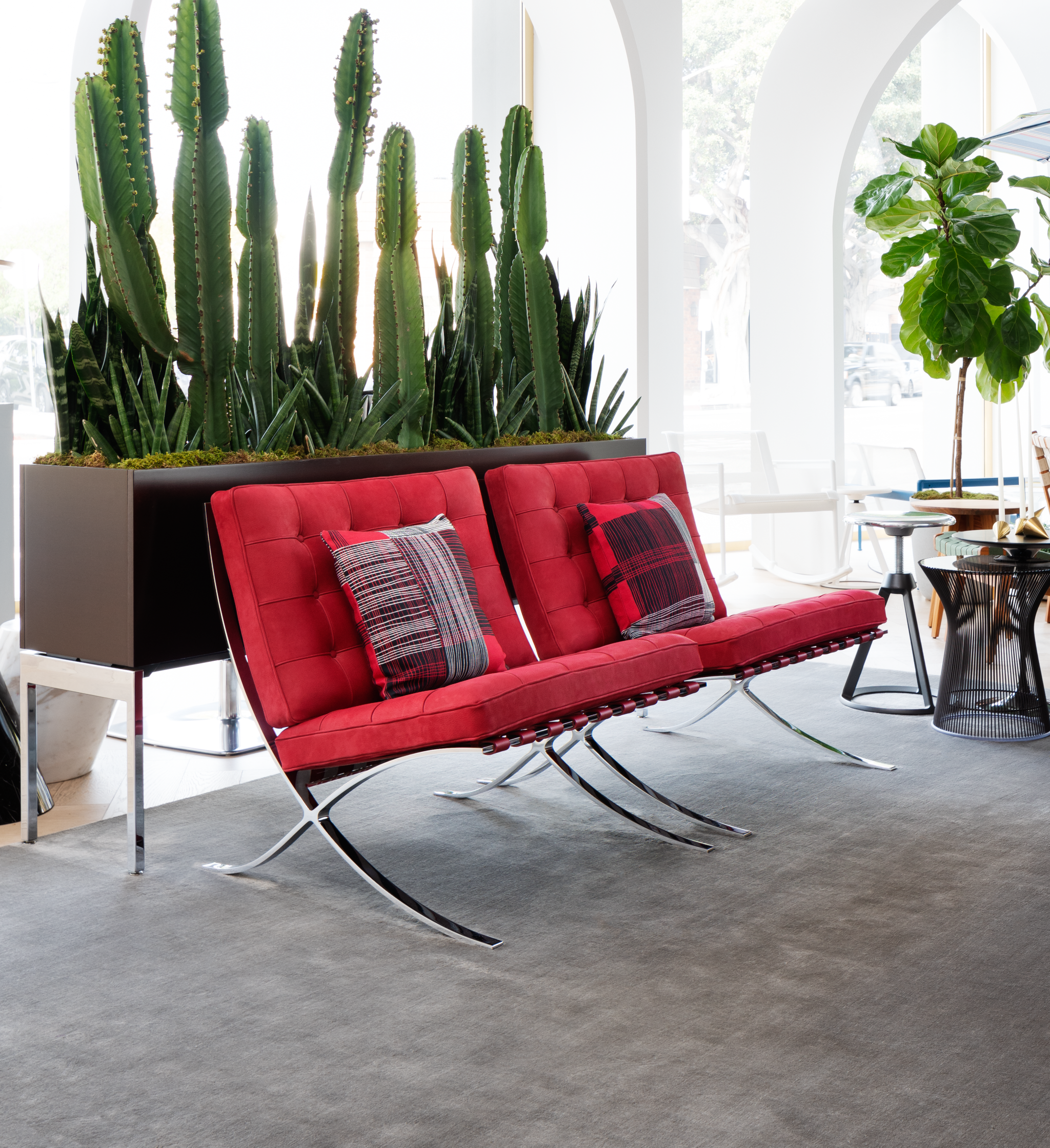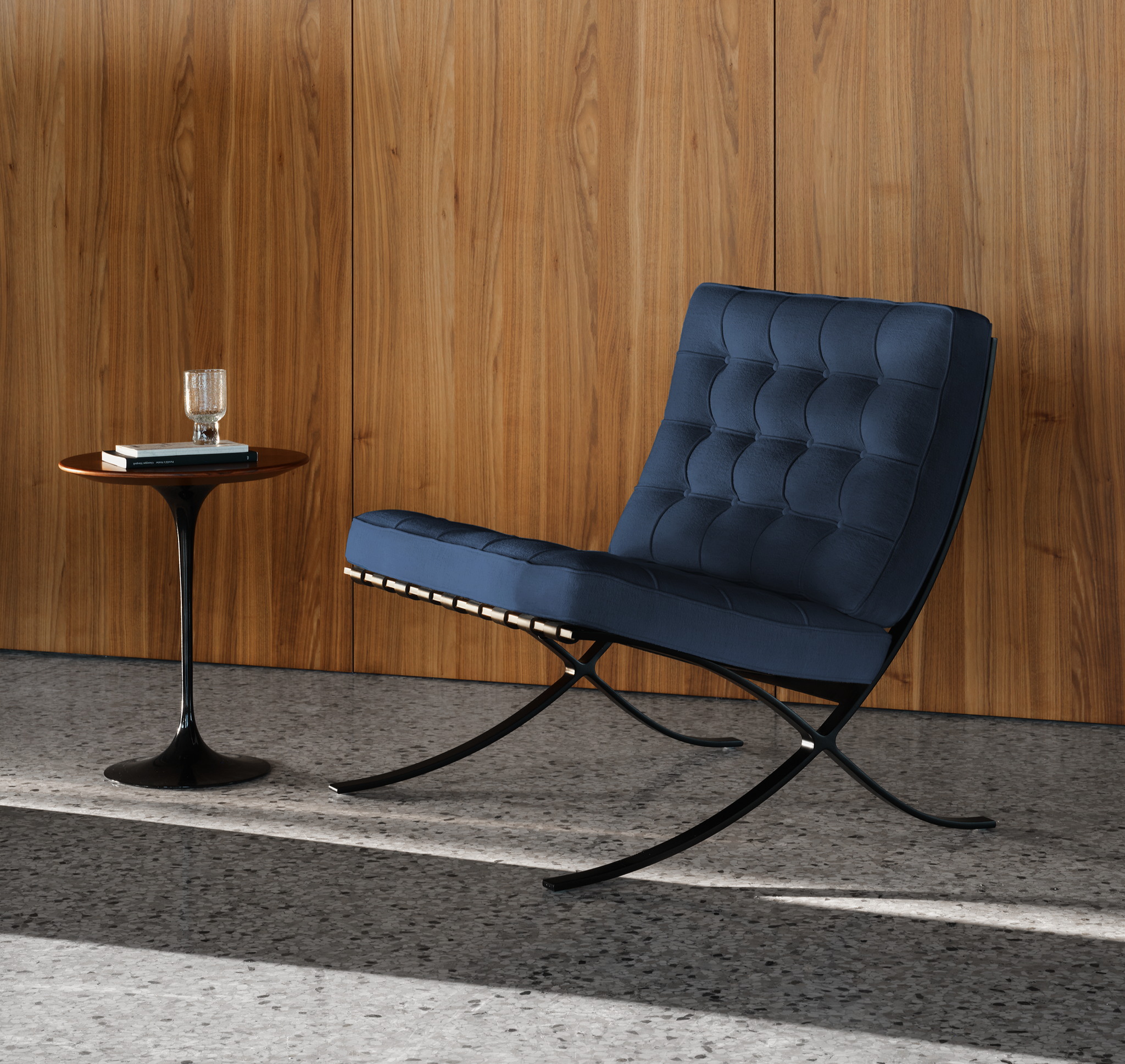 A Barcelona kollekció Ludwig Mies van der Rohe nevéhez fűződik, aki 1929-ben a német pavilon számára alkotta meg a Barcelona fotelt a barcelonai Nemzetközi Kiállításra. Az egyszerre letisztult és elegáns forma a modern építészet egyik ikonikus szimbólumává vált. A fényes krómozott vagy ultra-matt ónix váz, valamint a kézzel varrt, precízen összeillesztett párnák a kivételes kézművességet és a részletekre való figyelmet tükrözik.